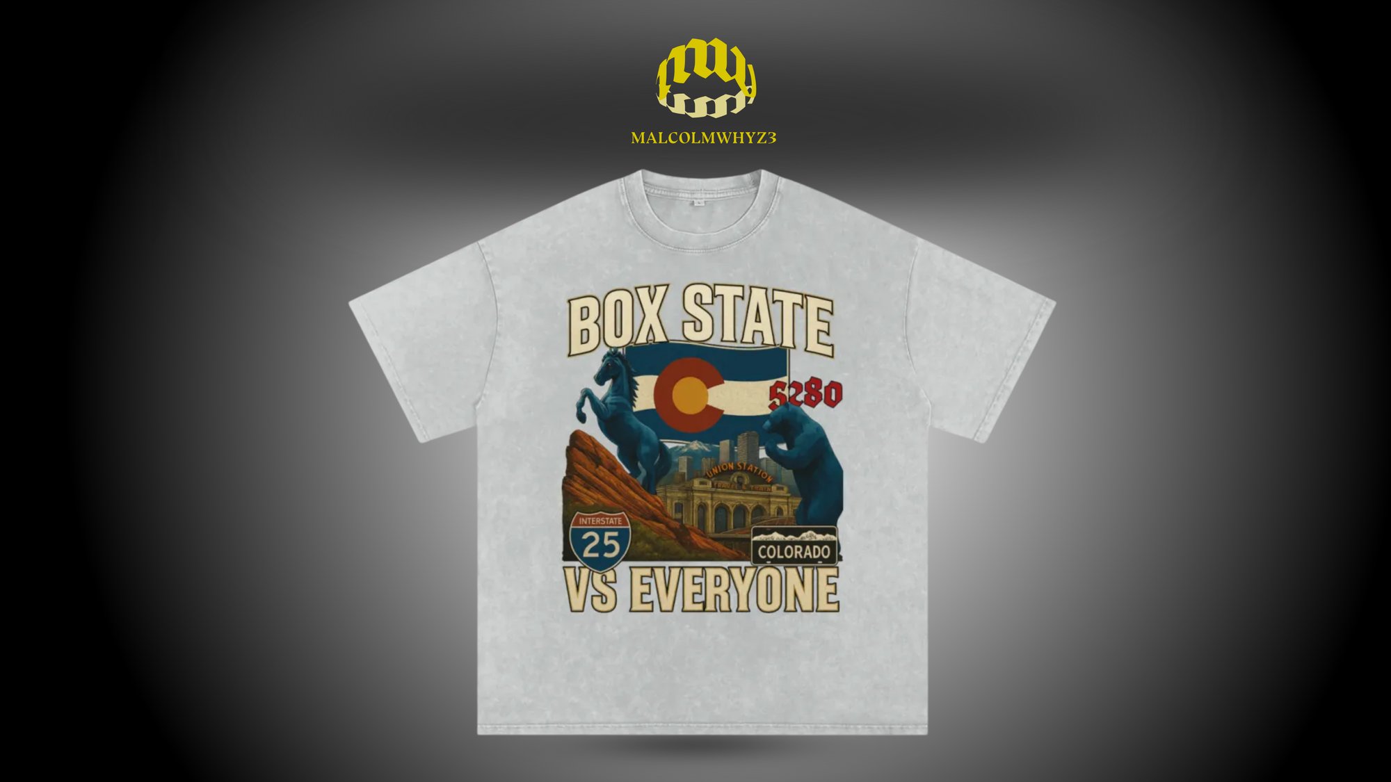 Stand out in this premium acid wash tee—crafted for a worn-in look that feels like an instant classic. Featuring a bold Box State vs Everyone graphic with iconic Colorado-inspired artwork, this shirt pairs rugged style with everyday comfort. The soft cotton fabric and unique acid-wash finish give each piece its own character, making every shirt one-of-a-kind. Perfect for repping Colorado pride in a laid-back, streetwear-ready way.